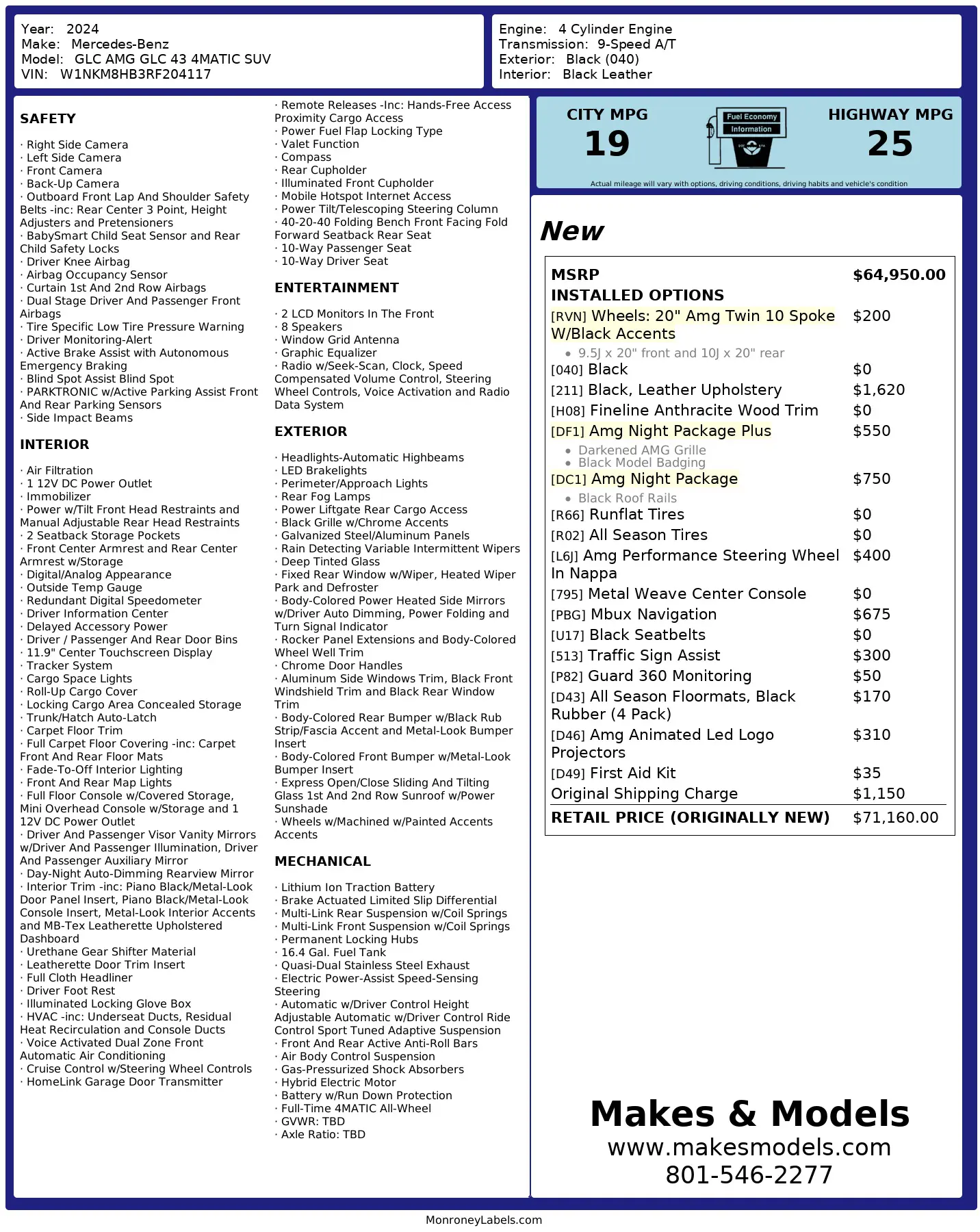 Finished in sleek black over black leather, the interior is further enhanced with carbon fiber accents and Fineline Anthracite wood trim. Factory options include 20-inch AMG wheels, AMG Night Package Plus, AMG Night Package, AMG Performance steering wheel, black leather upholstery, navigation with traffic sign assist, Guard 360 monitoring, and AMG animated LED logo projectors, bringing the original MSRP to $71,160.